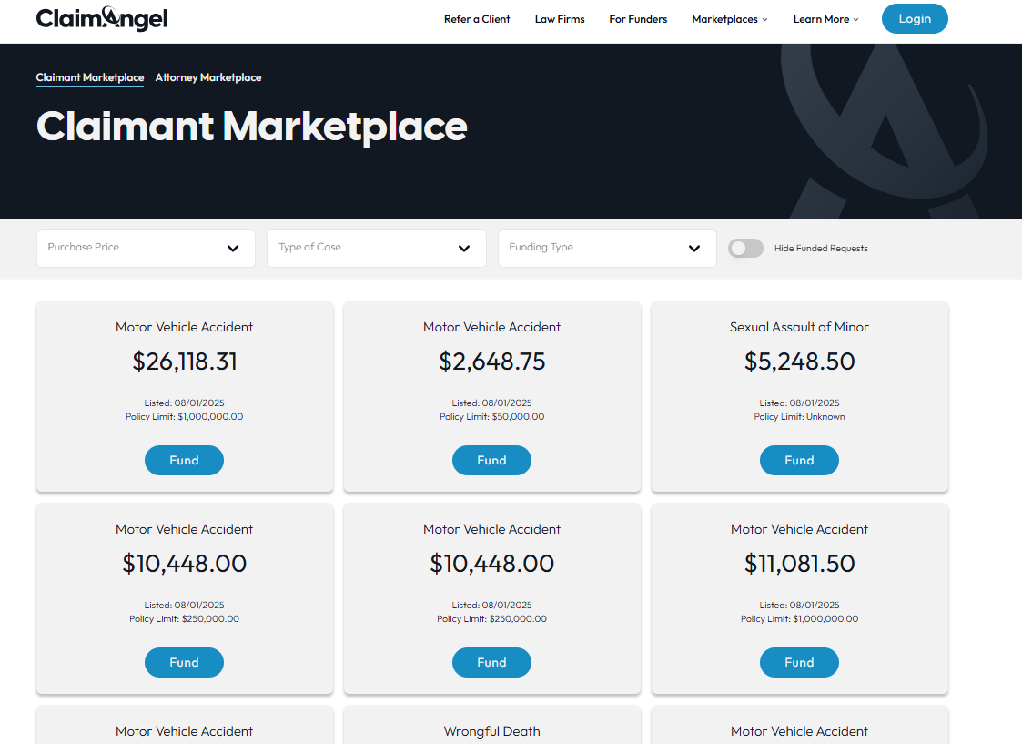 "The first and only legal funding marketplace where funders deploy capital, attorneys protect and people win." - ClaimAngel[11]